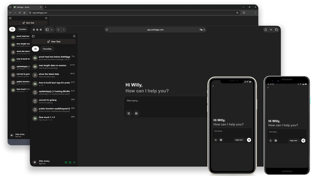 Higgs is designed to work with you - whether you're on Windows, Mac, iOS, or Android. Our platform supports seamless integration across devices and operating systems, delivering a smooth, secure experience across any device. With dedicated apps for desktop and mobile, plus web-based access, Higgs fits into your workflow - no matter where you work.